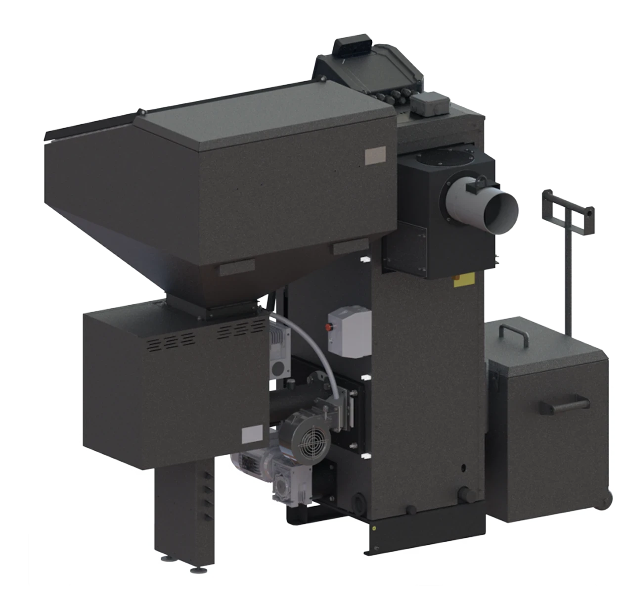 - реверсивная система защиты от заклинивания шнека. В случае попадания в топливо твердых кусков породы или инородных тел, включается механизм реверсивного движения шнеков. Он делает три попытки и порода либо промалывается, либо механизм подачи останавливается и котел сигнализирует о необходимом вмешательстве для чистки механизма подачи.