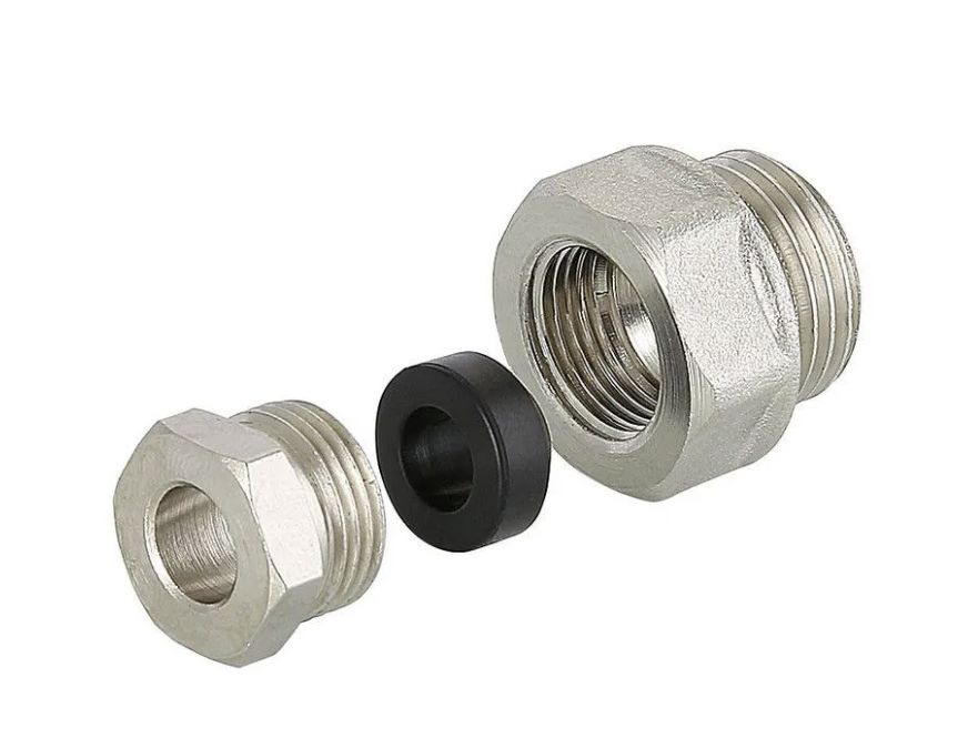 Переходник включает в себя футорку, прижимную втулку и концевую обжимную резиновую манжету. Футорка и втулка выполнены из никелированной латуни. Рациональнее всего использовать переходник совместно с косым тройником. В этом случае узел получается компактным, и греющий кабель заводится в трубу без перегиба. Переходник предназначен для использования в системах с рабочим давлением не выше 10 бар, максимальная температура рабочей среды – 110 °C.
